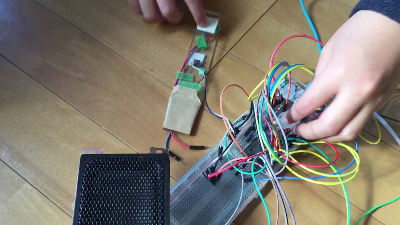 ロータリーエンコーダーを回すとノイズ音の高さが音階のように変わります。スイッチには前に作った軽い力で押せるスイッチを使いました。スイッチを押すと音が出ます。