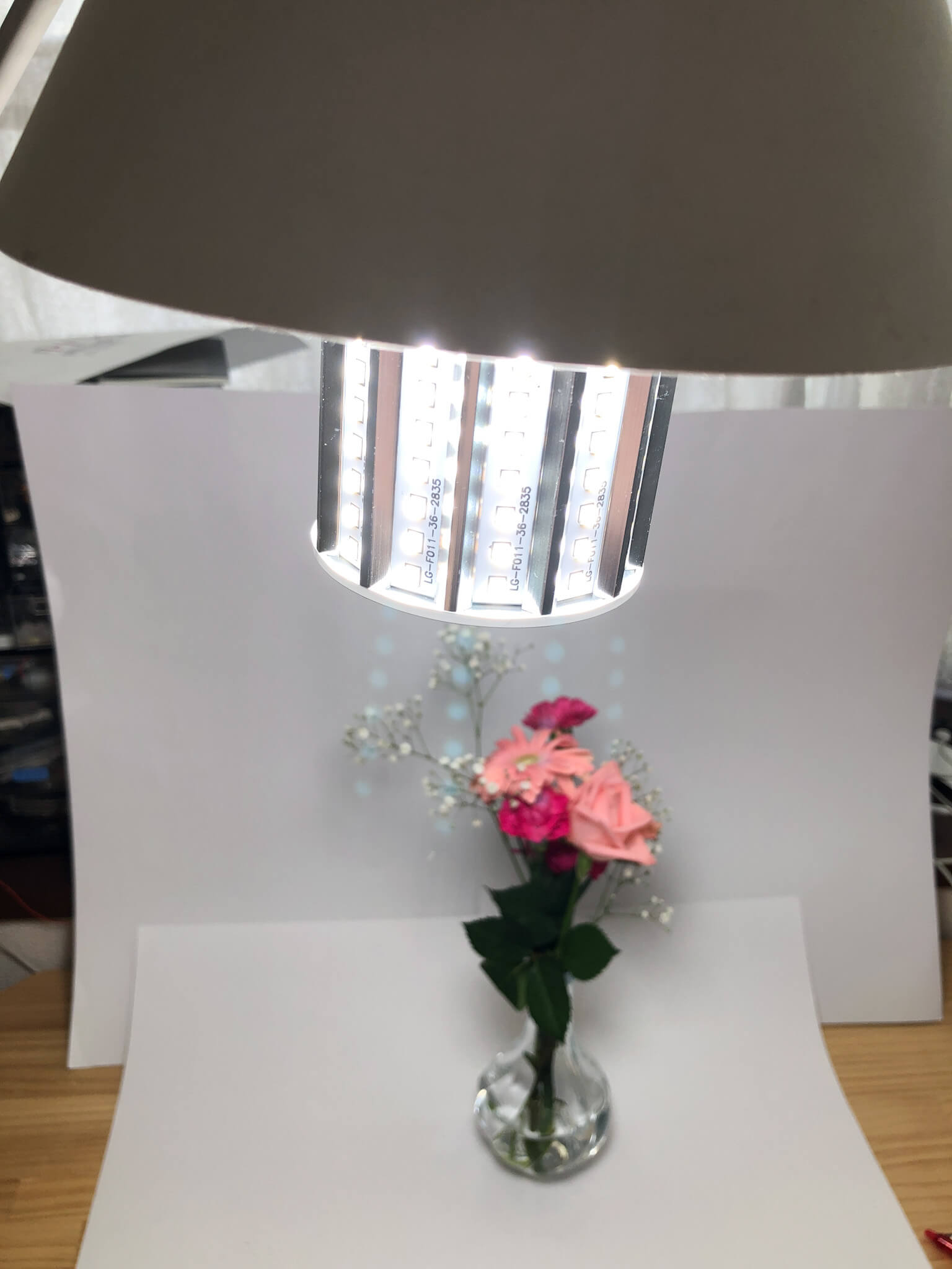 一般的にそうですが、安くて白いLEDライトはちょっと青味がかかっています。ホワイトバランスを調整すればいいのですが、部屋の撮影用高演色コーンライトとは色がちょっと違います。
