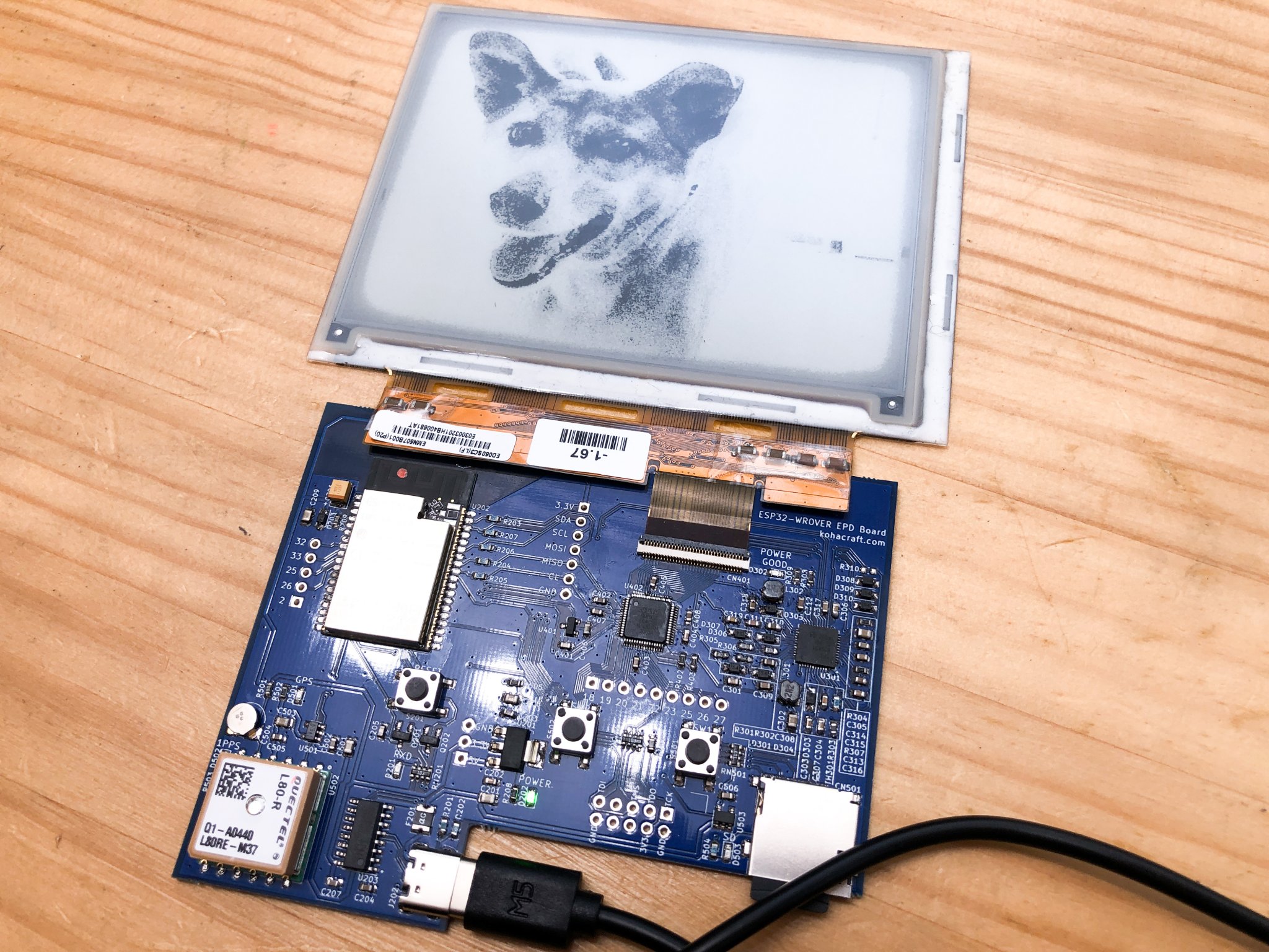 SDカードから画像を読み込んで、電子ペーパーに愛犬エヴァちゃんが近づいてくるアニメーションが表示されました。電子ペーパー基板、無事動作しました。