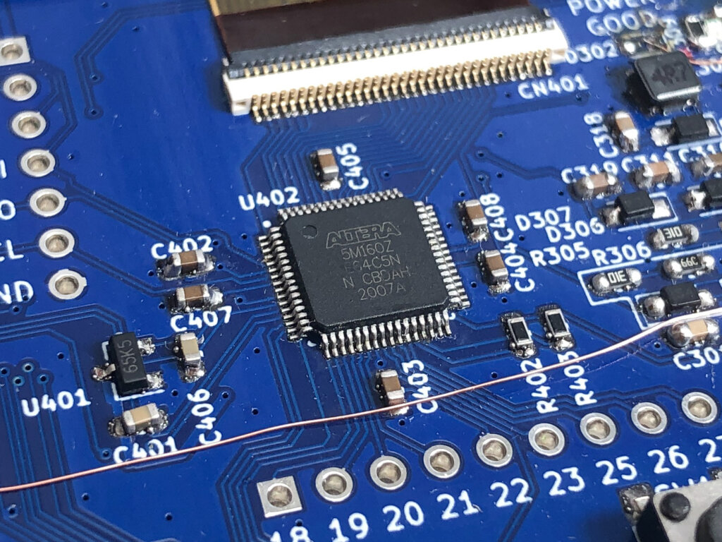 Intel MAX V CPLD 5M160を使って、SPI信号から電子ペーパーのパラレル制御信号にプロトコル変換をしていいます。ESP32のSPIから電子ペーパーへ、画像データを高速に転送できるようになったため、瞬間的な画像の更新ができるようになりました。