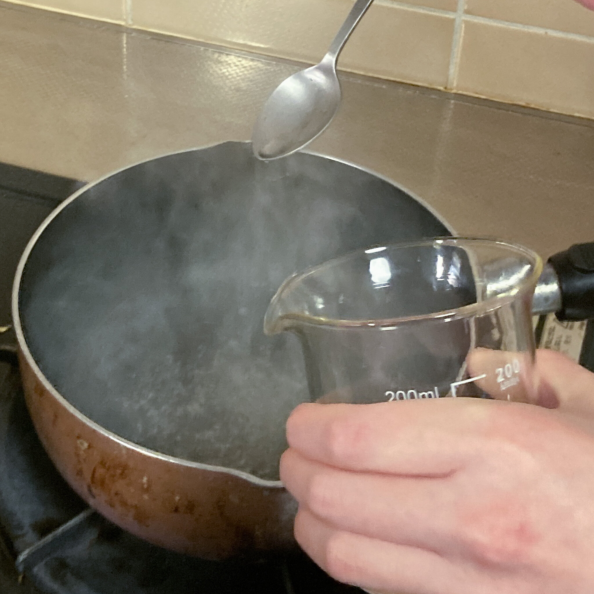 グリセリン1に対して、水を2の割合で混ぜます。すぐには混ざらないので、スプーンなどでよくかき回してください。