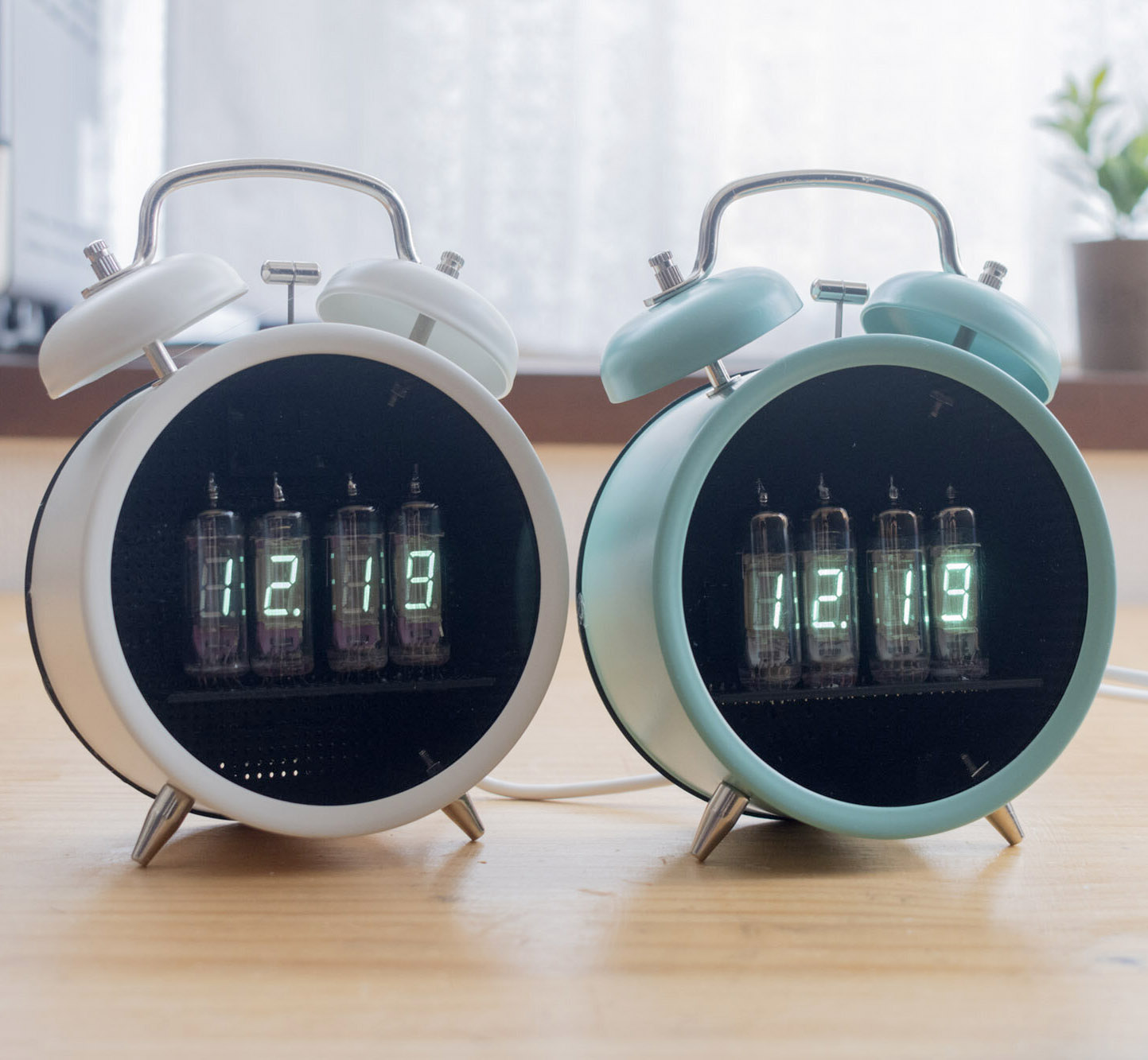 蛍光表示管と同じ色をした、目覚まし時計の姿のとてもかわいらしい時計です。目覚まし時計の姿をしていますが、残念ながらベルは鳴りません。真ん中のドットは1Hzで点滅します。