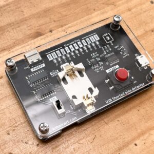 ピン間のショート実験ができるように、ターゲット基板を作りました。ターゲット基板と検出回路とは、USBケーブルで接続してあります。