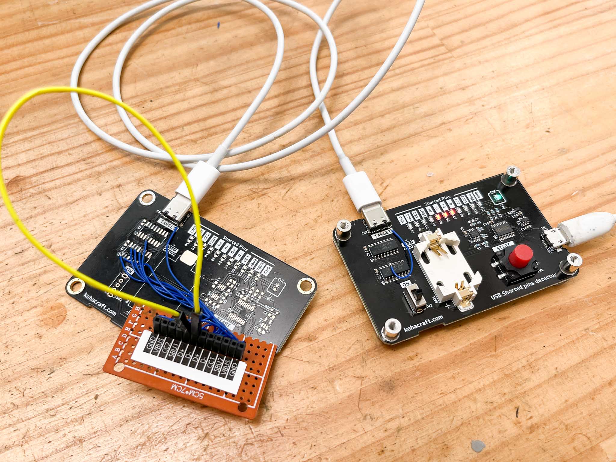 USBケーブルを使う場合、コネクタの裏表を考慮する必要があると言うこと。GNDとシールドがつながっていること。さらに、どんなケーブルを使ってもCC2ピン同士は結線されていないので、CC2ピンとのショートは検出できません。