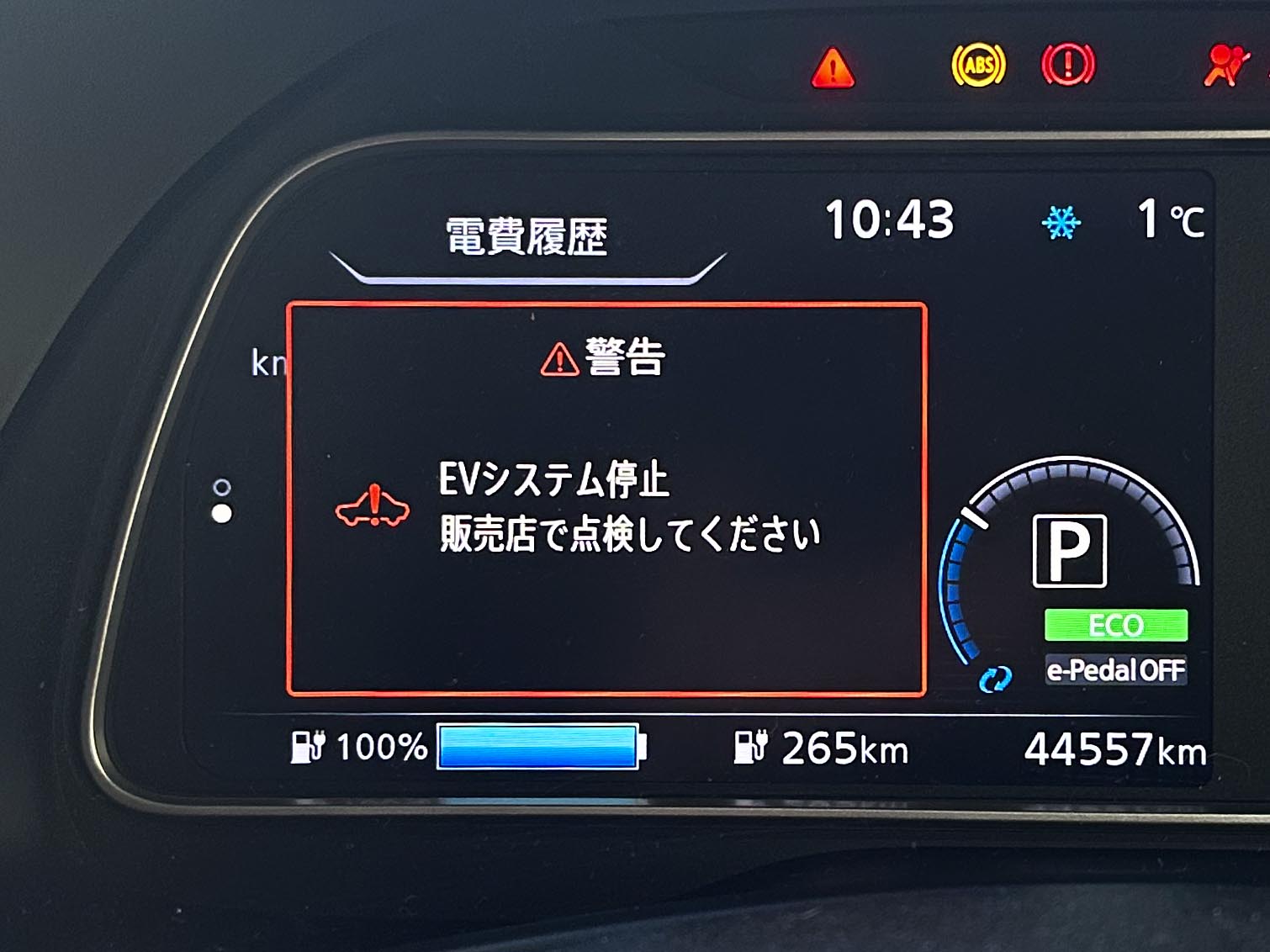 冬の朝、リーフでアクセサリー電源ONだけでカーナビを操作していたら、電源が落ちて突然メーターに「EVシステム停止」が表示されました。