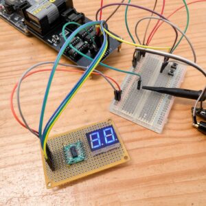 実験の様子です。手前の黒い基板がダミーロードです。奥にある7セグと黒い基板がPadauk PFS123を使ったPWMジェネレータ、右下が昇圧回路です。