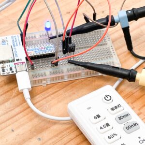 まずは、USBポートのチェックです。USB Type-Cのコネクタはピッチが狭く、はんだブリッジしやすくなっています。もしブリッジしていると、パソコンに接続した時にパソコンに悪影響があるかもしれないので、ショートチェッカーを使ってブリッジしていないかチェックします。青いLEDが点灯していれば、ショートせず正常です。チェックの結果、全て問題ありませんでした。