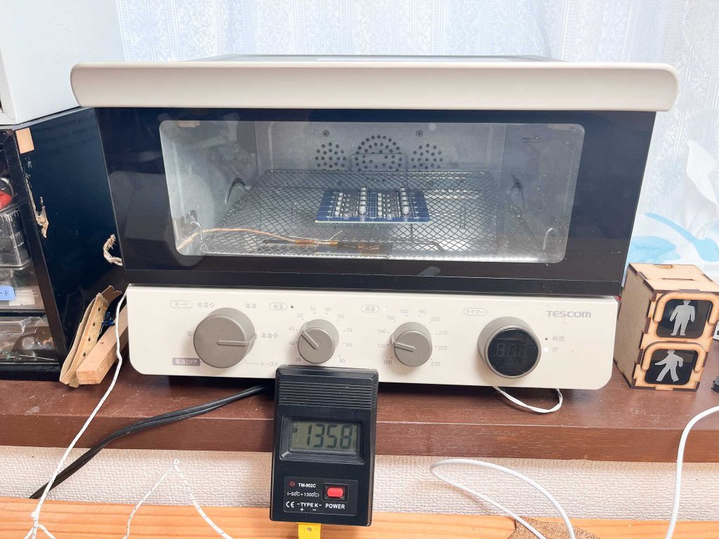 熱風が庫内を循環する、テスコムのコンベクションオーブンでリフローします。100℃→120℃→140℃→165℃と温度を上げてリフロー完了です。