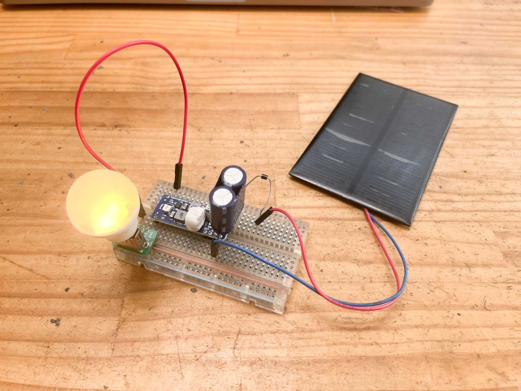 太陽電池とスーパーキャパシタを電源に、昇圧できるか確認です。スーパーキャパシタに充電された電気で、LED電球が光りました!!