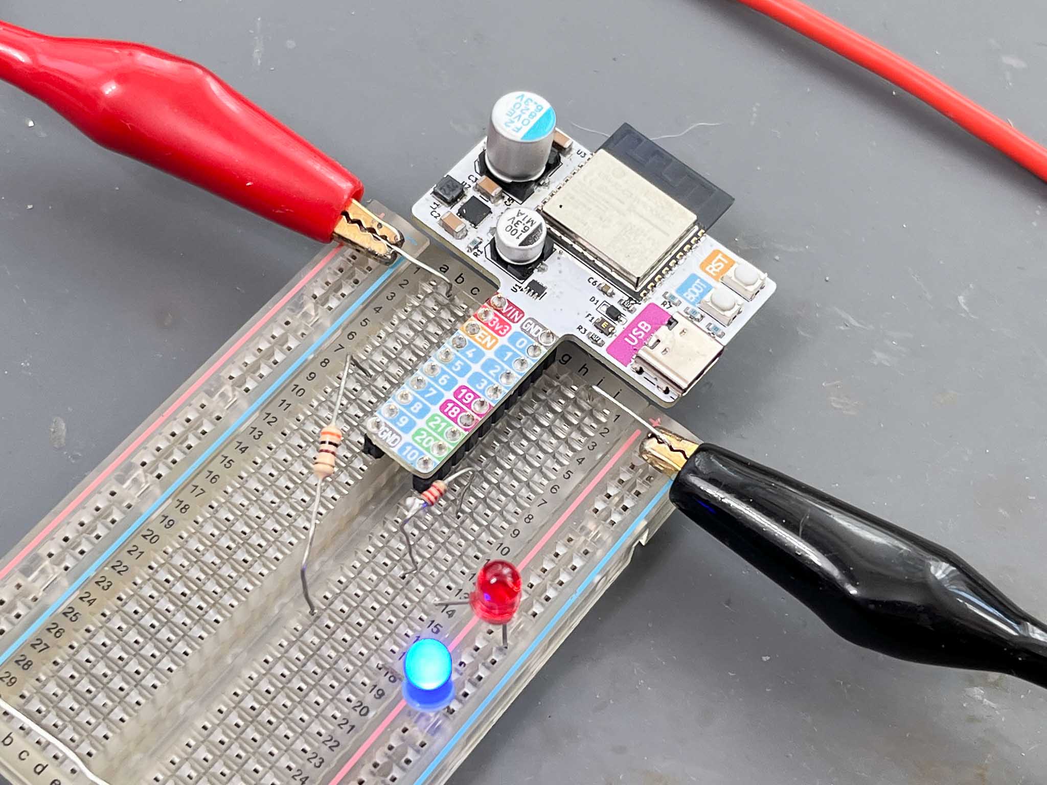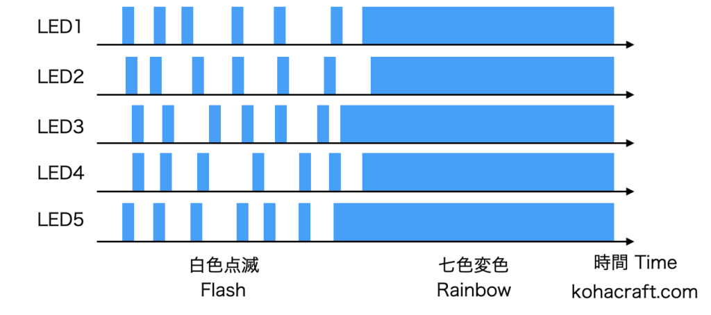LEDの点滅は上の図のような点灯をします。Flash LEDは、点灯した最初は白色に点灯します。この特性を利用して、一瞬だけ点灯させると白く光っているように見えます。