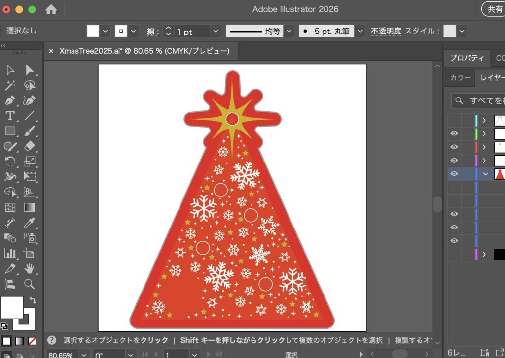 この三角の中に、雪の結晶と、小さな星などを配置します。シルク印刷の白と、金メッキの黄色の2色を使い描きます。