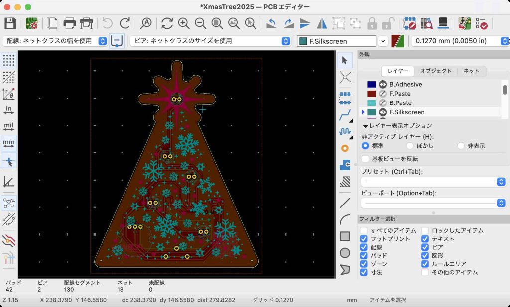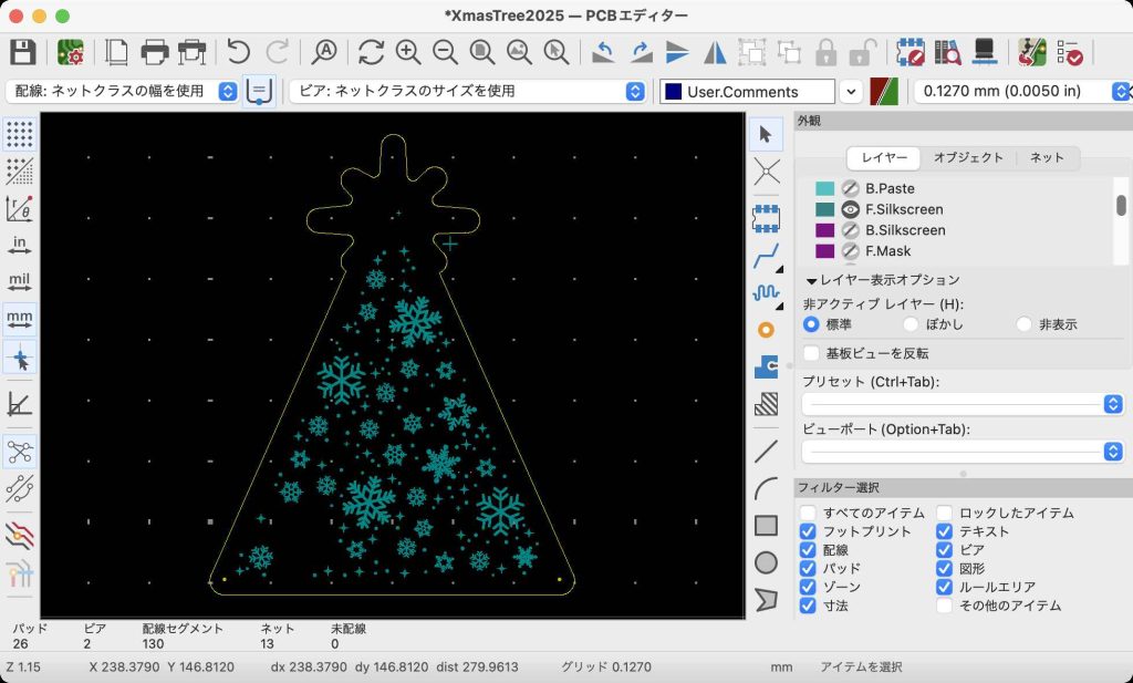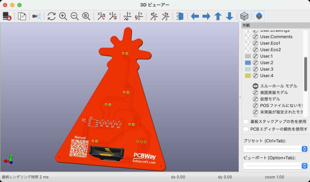 輪郭線を読み込みます。先ほど作ったデザインの輪郭線をSGV形式で保存し、KiCadの「ファイル」>「インポート」>「グラフィックス」でレイヤーを「Edge.Cut」に設定して、Edge.CutレイヤーにSGVファイルを読み込みます。