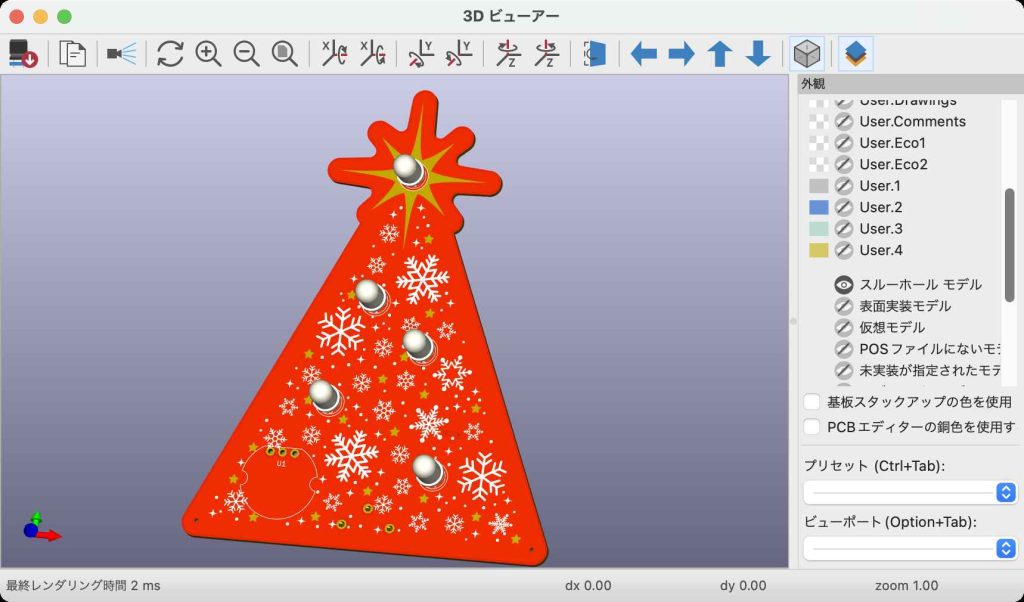赤い三角形には、雪の結晶のマークがたくさん描きます。。ツリーのてっぺんには星があって黄色のLEDが光ります。ツリー本体にはFlashLEDを取り付けてピカピカ光るようにします。左下には人体検知センサを取り付けます。このセンサで人の動きを検知して、LEDが光るようにします。