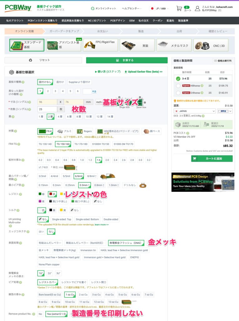 最初に「基板のサイズ」と「枚数」を設定します。あとはお好みで、変更したいところを変更します。今回は基板の色を赤にしたいので、「レジスト」を「赤」に、金属部分を金メッキにしたいので「表面処理」を「無電解金フラッシュ」に、あとは製造番号を印刷して欲しくないので、「Remove product No.」を「Yes」にしました。以上で基板の設定完了。