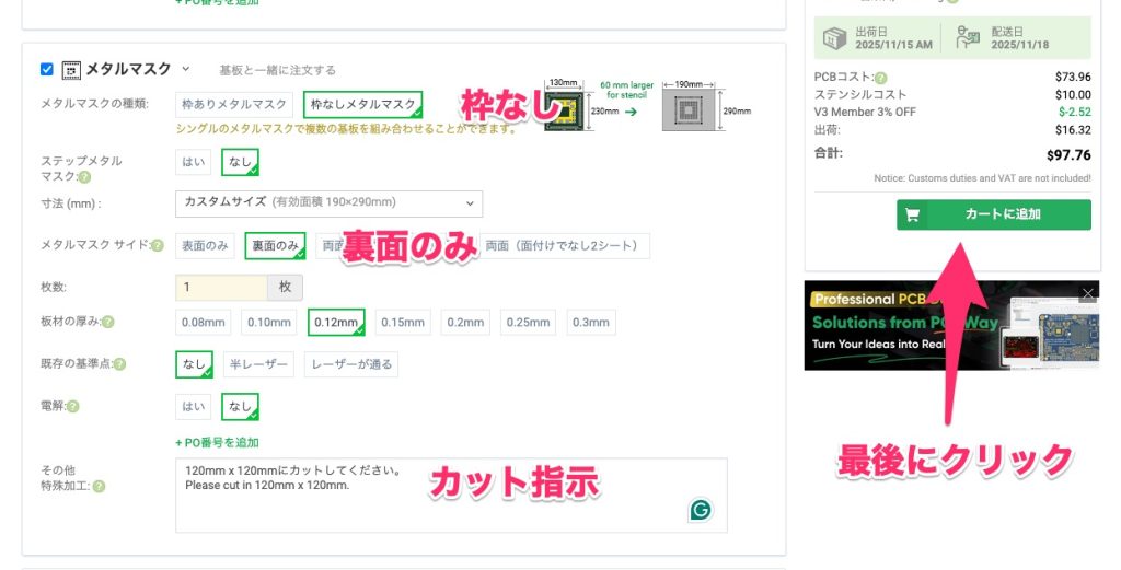 デフォルトからの変更部分は「枠なし」「裏面のみ」。あと、そのままではメタルマスクのサイズがとても大きいので、適当なサイズにカットしてもらいます。「その他特殊加工」の欄に「120mm x 120mmにカットしてください」と書いておきます。PCBWayは日本語でも大丈夫です。だたレビューに時間がかかる傾向があります。